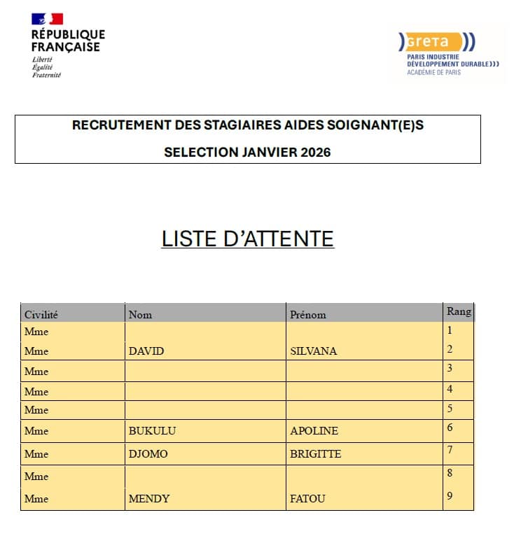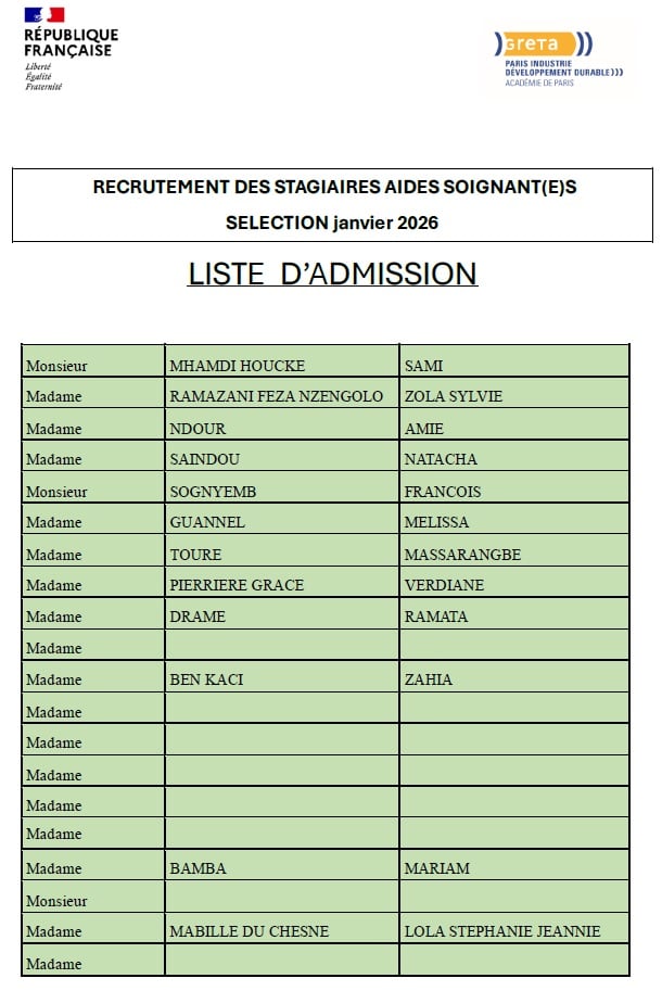 Les candidat(e)s ci-dessous sont retenu(e)s soit sur liste principale, soit sur liste d’attente pour l’entrée en formation d’aide-soignant à l’IFAS du GRETA GPI2D, à Paris.